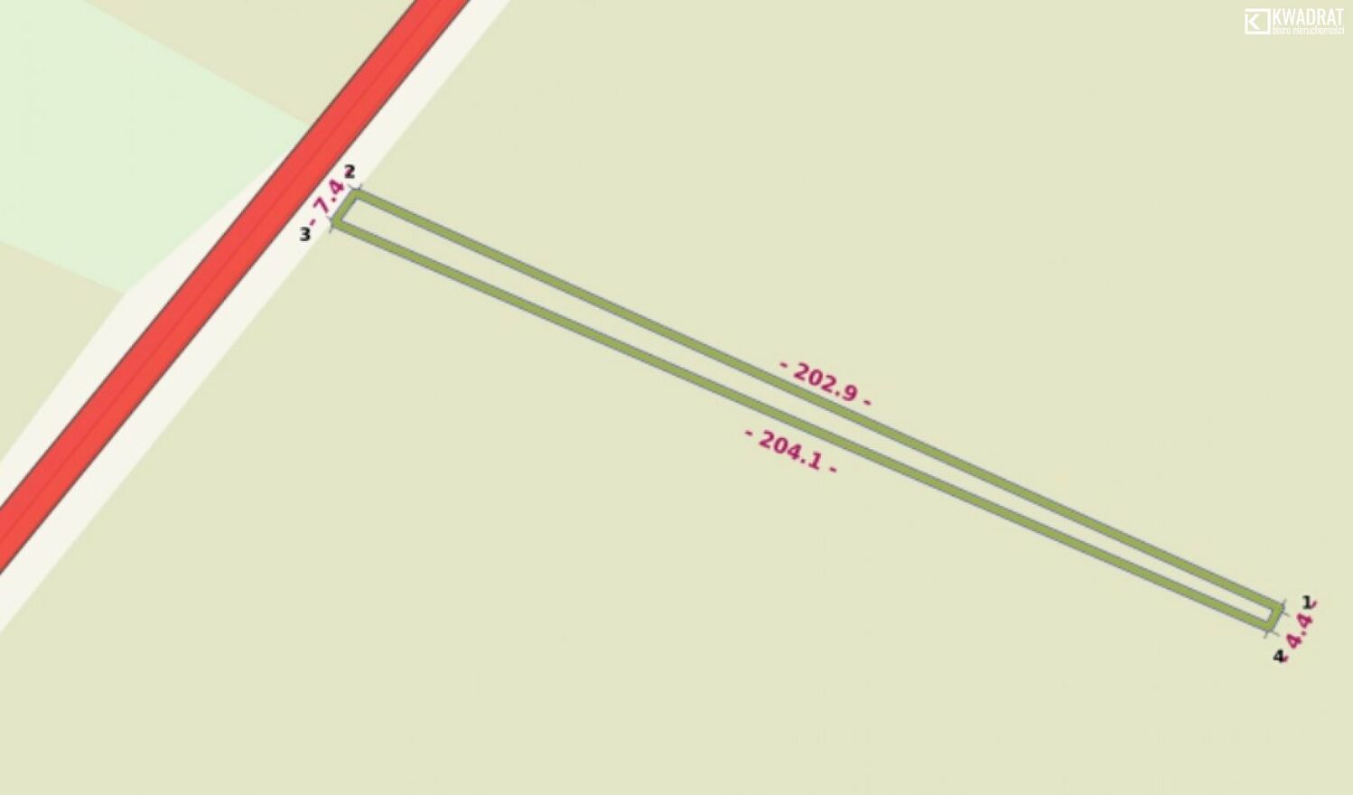 Wymiary działki: szerokość 4,4-7,4 m., długość 202,9-204,1 m.
